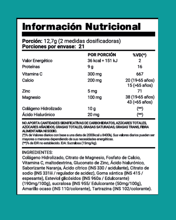 Principales ingredientes por porción: Proteínas 9 g, Vitamina C 300 mg, Calcio 200 mg, Colágeno hidrolizado 10 g, Ácido Hialurónico 20 mg, Magnesio 100 mg, Zinc 5 mg.