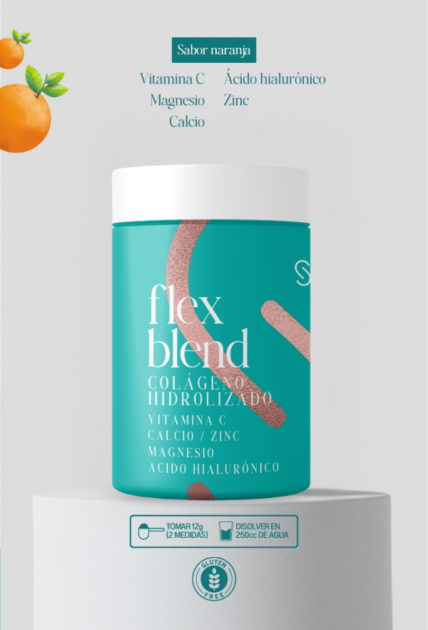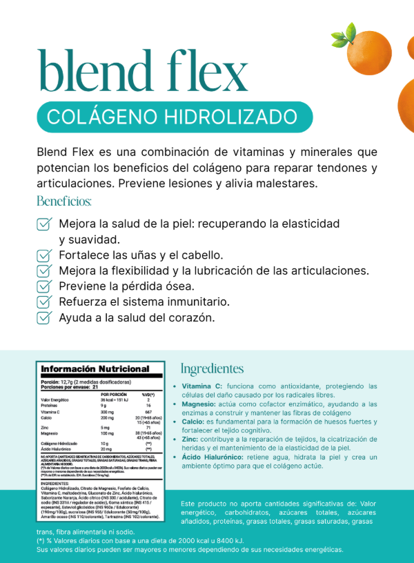 Colágeno Hidrolizado Flex Blend: es una combinación de vitaminas y minerales que potencian los beneficios del colágeno para reparar tendones y articulaciones. Previene lesiones y alivia malestares.